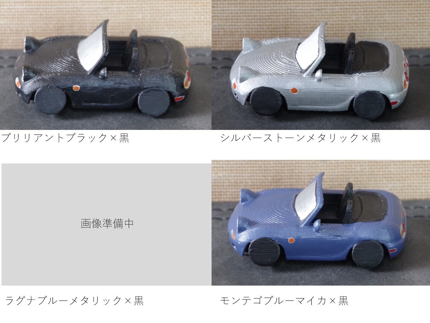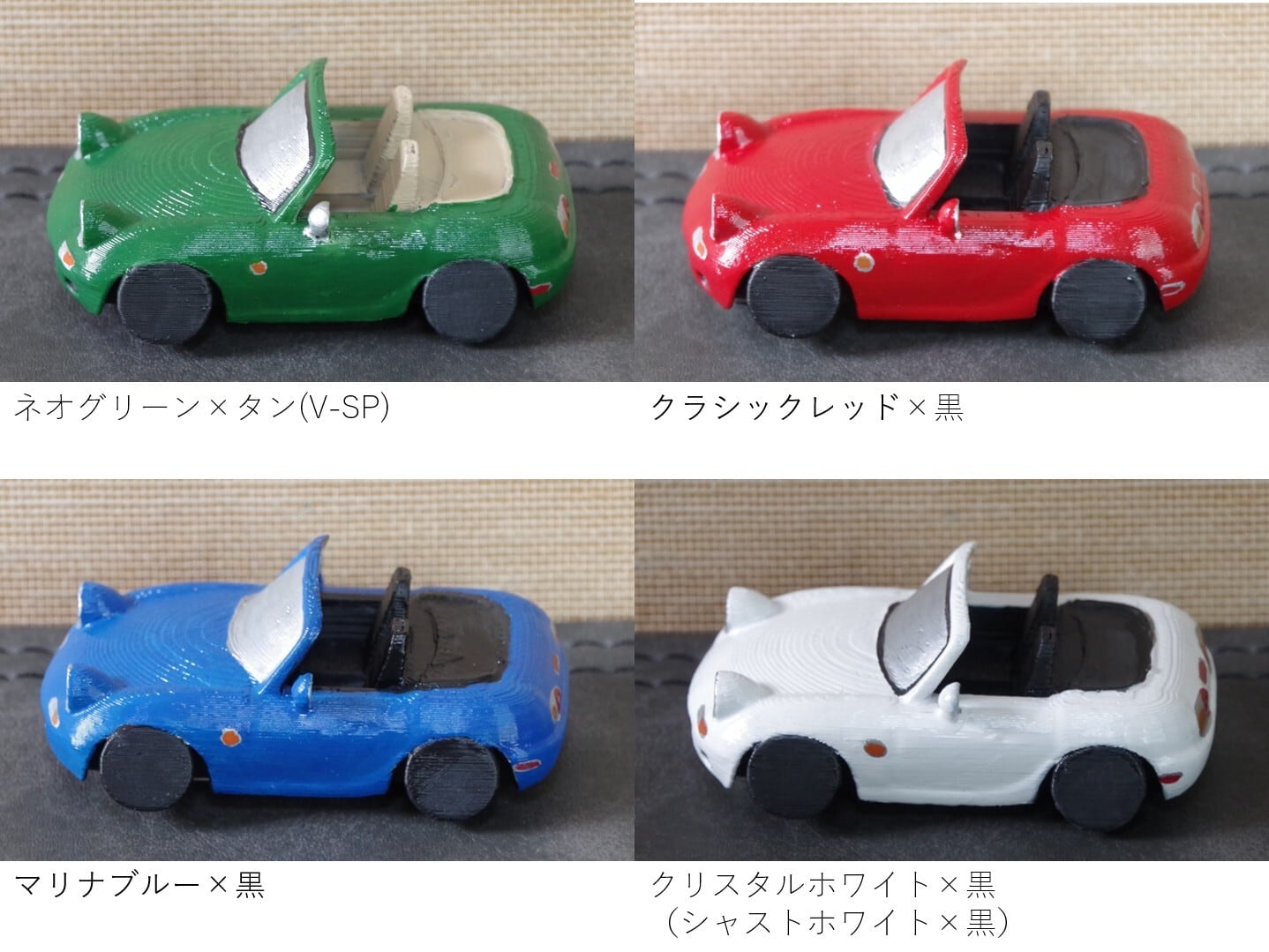 NAロードスターをデフォルメした模型をカラフルに塗装したピンバッジです。